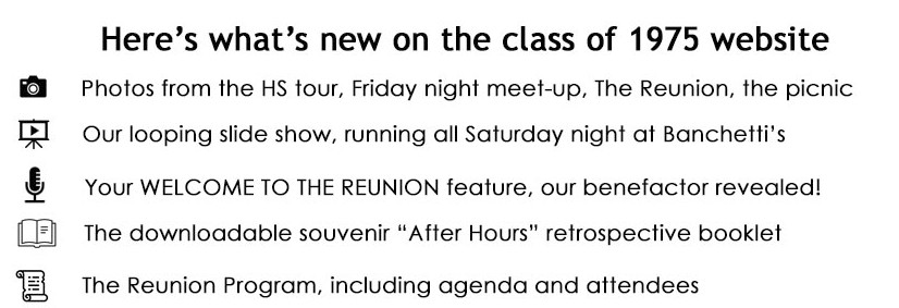 6:00-11:00 Reunion dinner party, open bar, music at Banchetti’s Grove 550 N. French, Amherst.